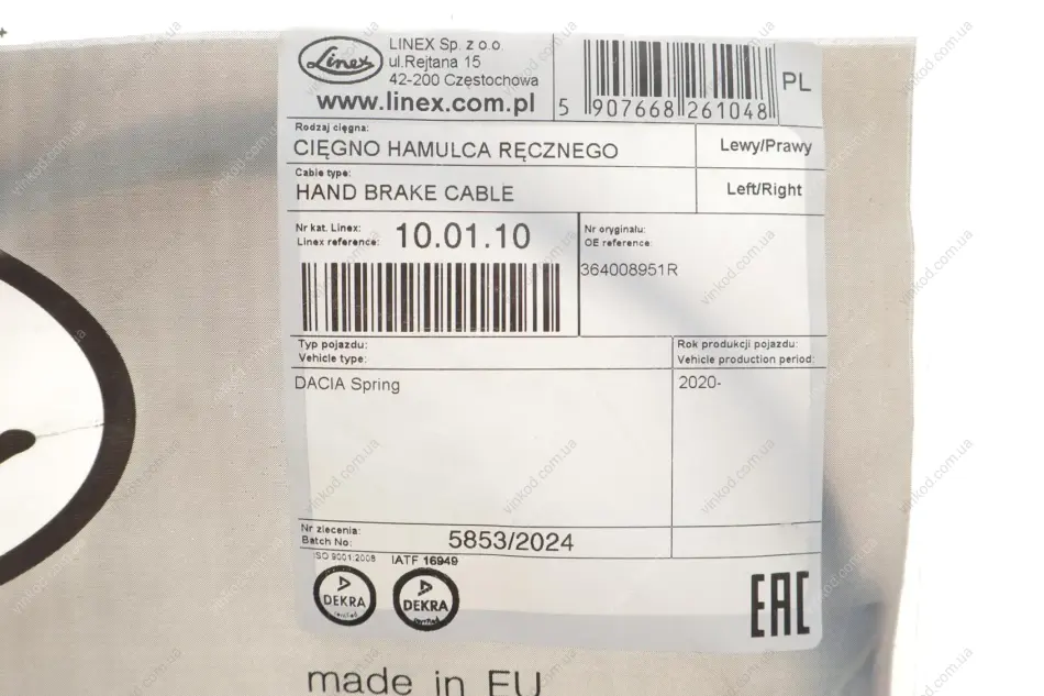 Интернет-магазин автозапчастей «ВИНКОД» предлагает купить Трос ручного гальма LINEX 10.01.10 LINEX 100110. Работа с официальными поставщиками гарантирует приобретение только качественного товара. У Вас так же есть возможность заказать Трос ручного гальма LINEX 10.01.10 LINEX 100110 с крупных складов Объединённых Арабских Эмиратов (ОАЭ) и Соединенных Штатов (USA), Польши, Германии по оптовой цене и в оптимальные сроки (от 5 до 16 дней), мы гарантируем доставить практически любую деталь даже на эксклюзивный автомобиль.