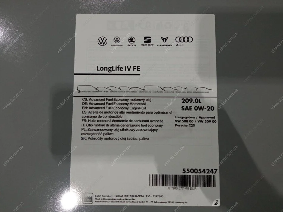 Олива моторна LongLife IV SAE 0W20 (209 Liter) VAG GS60577M9